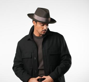 Die berühmte Prestigemarke wählte für diese Kreation den Fedora aus hochwertigem Filz. Das Modell ist dank eines Designs von hoher Qualität, elegant und schick, bequem. Der ikonische Hut ist hier mit einem einfachen Satin-Grosgrain verziert, das den Namen seines Schöpfers in goldener Schrift trägt. Er kann allein unseren Look veredeln.