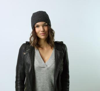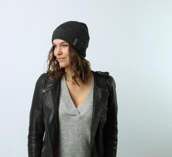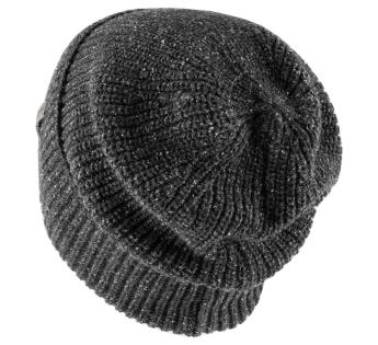 Beanie aus doppellagiger Jersey-Wolle gestrickt. Gesprenkeltes Anthrazitgrau, sein leicht distressed Look verleiht ihm mehr Charakter und Zeitlosigkeit. Die unverzichtbare Beanie ist hier mit einem Revers für eine gute Passform versehen. Ein Lederabzeichen verstärkt seinen Vintage- und traditionellen Charakter.