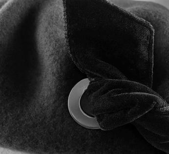 Dieses neu interpretierte Béret spielt mit Kontrasten mit Kühnheit und Raffinesse. Seine baskische Form, mit einem mittleren Schnitt, wird durch ein Duo aus starken Details verdreht: eine handgeflochtene Samtschleife und zwei metallische Ösen, die die Silhouette modernisieren. Ein subtiler Ausgleich zwischen Tradition und Design, gedacht für einen selbstbewusst femininen Look.