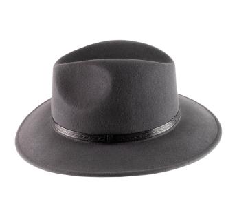 Chapeau in Traveller-Form, der optimalen thermischen Komfort für eine konstante und angenehme Temperatur bietet. Das Material besteht aus Filz aus sehr feiner, warmer und leichter Wolle. Die Haptik ist weich und die Form ist mit einer Verzierung aus geprägtem Leder mit geometrischem Muster dekoriert.