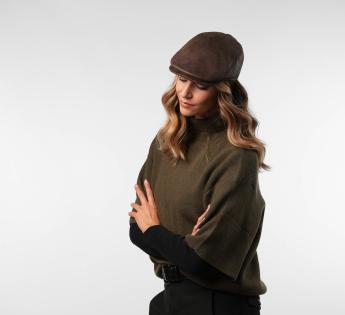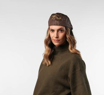Mit seinem flexiblen Material, das sich wie Pfirsichhaut anfühlt, evoziert dieser duckbill elegant die Patina von fahl Leder. Sein tiefbraunes Finish wird dezent durch ein goldenes, rissiges Muster belebt, das auf der Rückseite gestickt ist, ein Hinweis auf die Kunst des Kintsugi, bei der Unvollkommenheit kostbar wird.