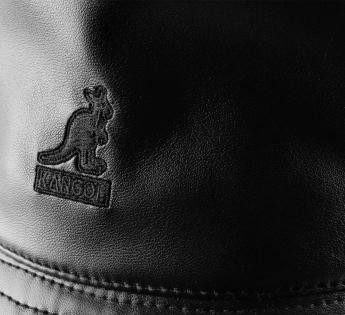 Ein Stil, der für Modebegeisterte gemacht ist, irgendwo zwischen einem Rockgeist und Haute Couture. Der Hut ist aus einem schönen Kunstleder gefertigt, das sehr fluid und glänzend ist. Er präsentiert einen Look in Schwarz auf Schwarz mit einer abnehmbaren mattschwarzen Kette und einer tonalen Stickerei auf der Vorderseite.
