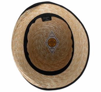 Handgefertigt aus genähtem Stroh, das Flechtwerk aus Stroh wird mit einem Drehteller Krempe an Krempe gewickelt und genäht.