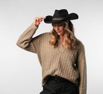 Dieser Westernhut besticht durch die Freiheit, die er seinem Träger bietet. Seine breite Krempe, vollständig mit Messing eingefasst, kann nach Belieben geformt werden: hochgeklappt für einen ausgeprägten Cowboy-Geist, leicht gebogen für einen dezenteren Stil oder gerade gelassen für einen zeitgenössischen Look. Ein wahres stilistisches Spielfeld.