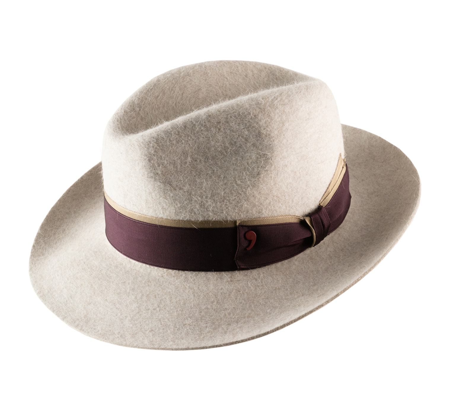 Fedora neu interpretiert mit einem mittellangen Rand, geformt aus flexiblem Filz, der leicht zu accessoirisieren ist. Mit einer Drahtbürste wurden die Haare des Kopfbedeckung gezogen, um diese Illusion von Fell zu erzeugen. Das Modell wird durch eine moderne und dynamische Schicht von Bändern ergänzt, die eine gespaltene Kopfhöhe umschließt.