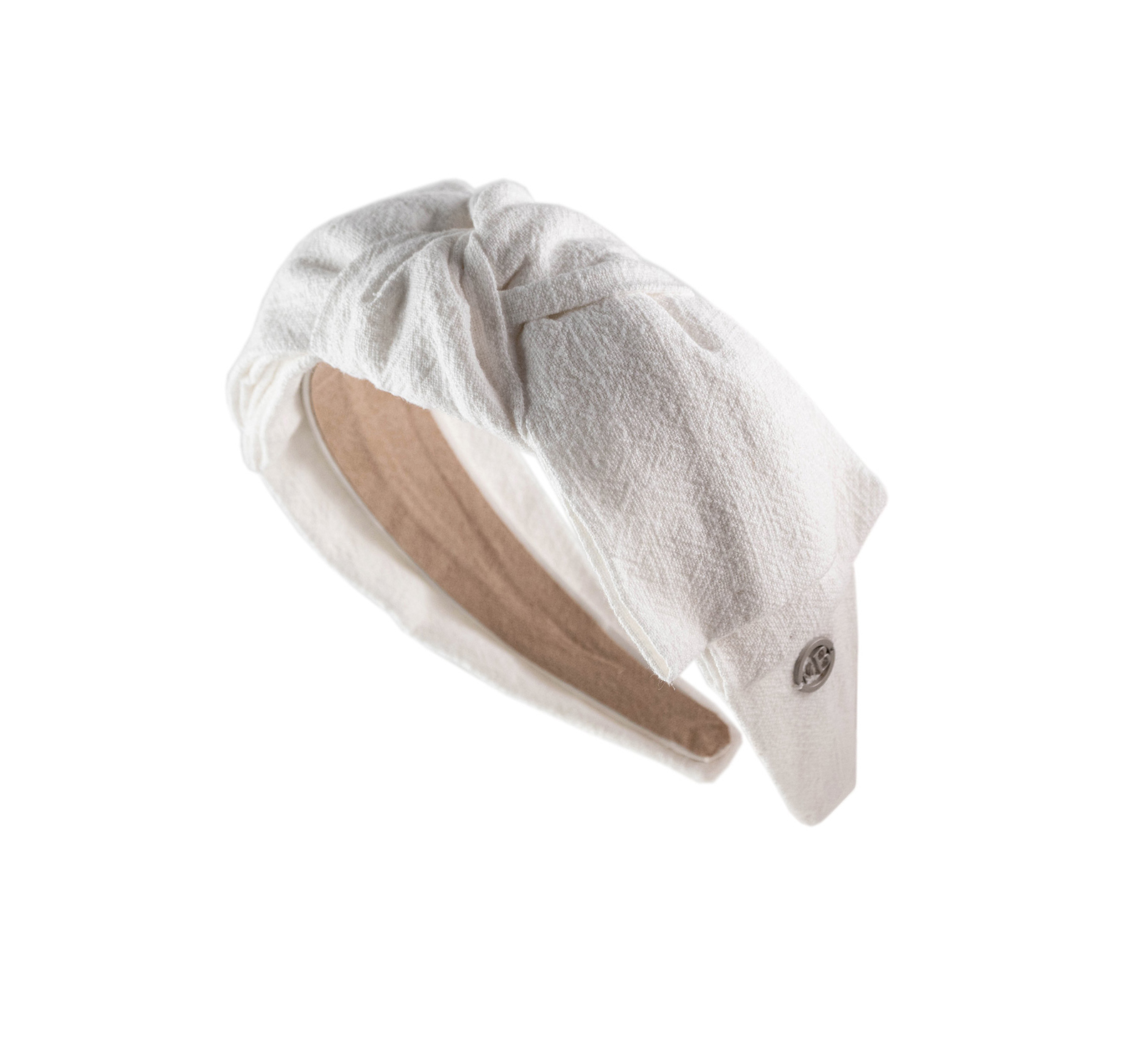 In unserem Atelier gefertigt, vereint dieses Kopfjuwel das perfekte Gleichgewicht zwischen Stirnband und Turban. Der doppelt gedrehte Knoten aus Leinen, dezent asymmetrisch an der Seite, verleiht ihm eine besondere Note – elegant, ohne streng zu wirken.