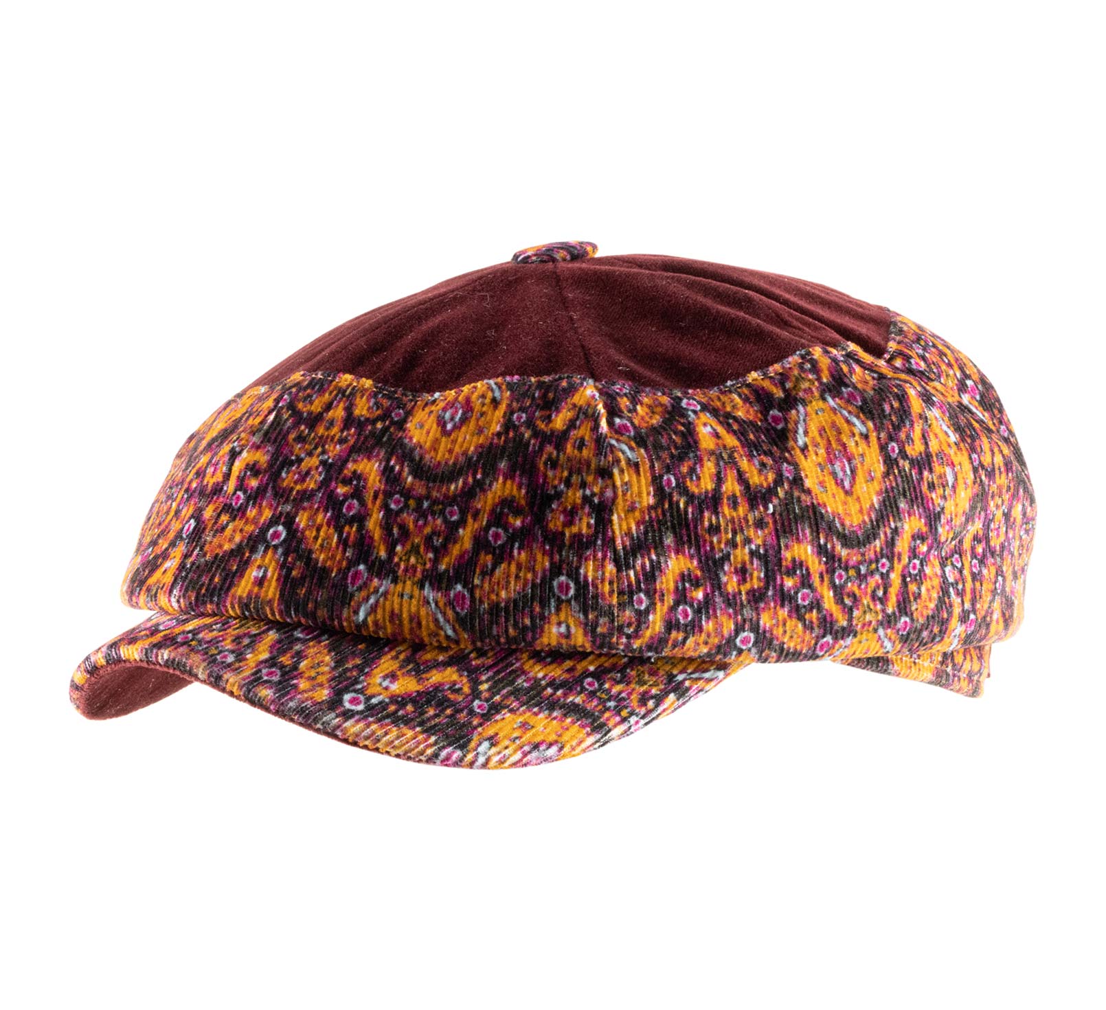 Irische Kappe in einem Schnitt, daher weit. Sie besteht aus einer Mischung aus feinem Samt und dickerem Cord-Samt. Die Mischung ist somit weich und bequem in einer bunten und üppigen barocken Dekoration. Die Kappe wird in einem lässigen Design mit schönem Volumen angeboten, das es zudem ermöglicht, sie zur Seite zu tragen.