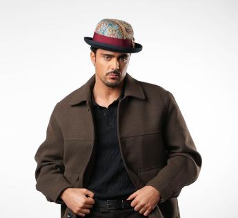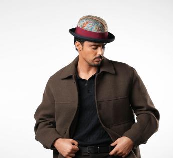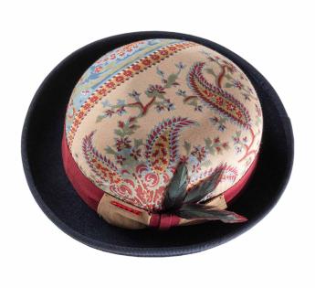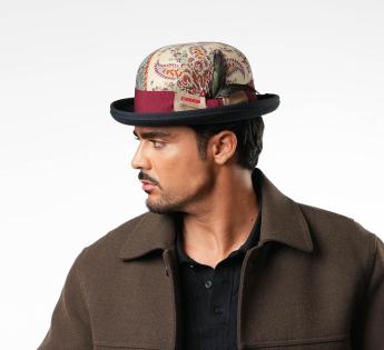Ein herausragendes Stück in limitierter Auflage, dieser Bowler, der mit einem Vintage-Stoff im Paisley-Muster überzogen ist, zeichnet sich durch seine einzigartige Ausstrahlung aus. Jedes Exemplar weist eine unterschiedliche Musterplatzierung auf, was jeden Hut wirklich einzigartig macht. Eine sorgfältig gearbeitete Verzierung, verstärkt durch einen zweifarbigen Galon und eine Hahnenschwanzfeder mit grünen und bordeauxroten Schattierungen, zeichnet eine kühne und raffinierte Silhouette.