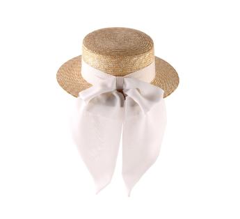 Boater Kreissäge aus fein genähtem Stroh, hergestellt in Italien. Er ist mit einer handgefertigten Musselin-Schleife aus unserer Werkstatt in Frankreich verziert. Es handelt sich um ein Modell für kleine Mädchen, ganz in Eleganz.
