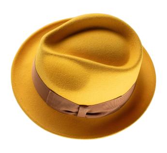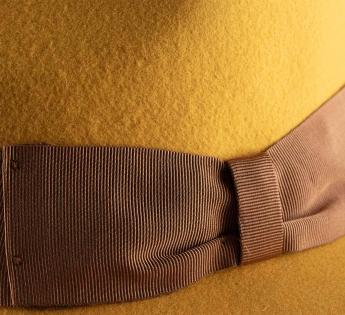 Mit seiner kurzen Krempe und leicht erhöhten Kopfhöhe lässt sich dieser Trilbyhüte gerne seitlich geneigt oder nach hinten gekippt tragen, um die Linie zu brechen. Der Grosgrain-Galon, der mit einem flachen Knoten endet, unterstreicht den eleganten Geist des Modells.