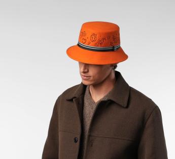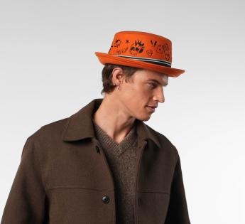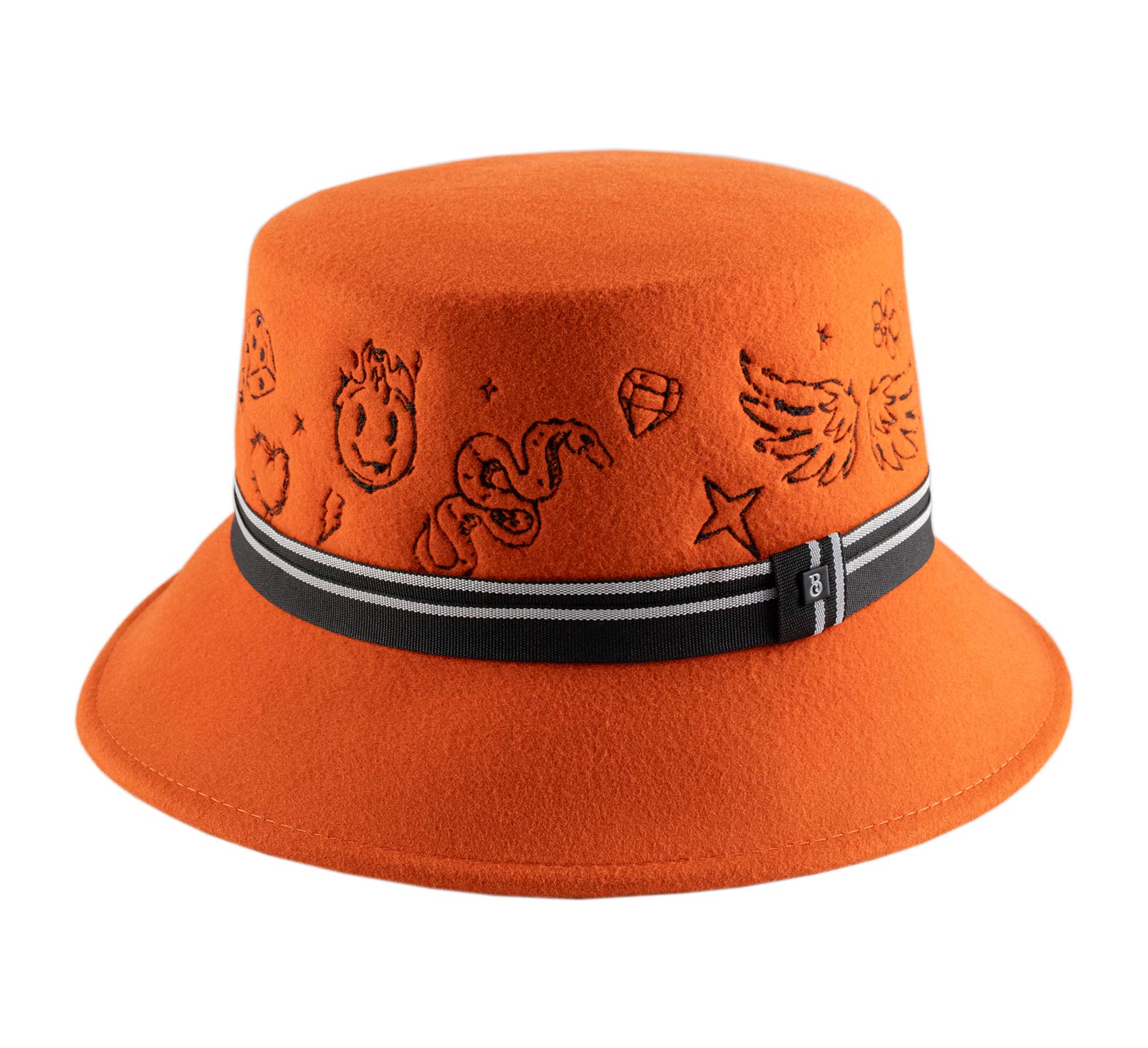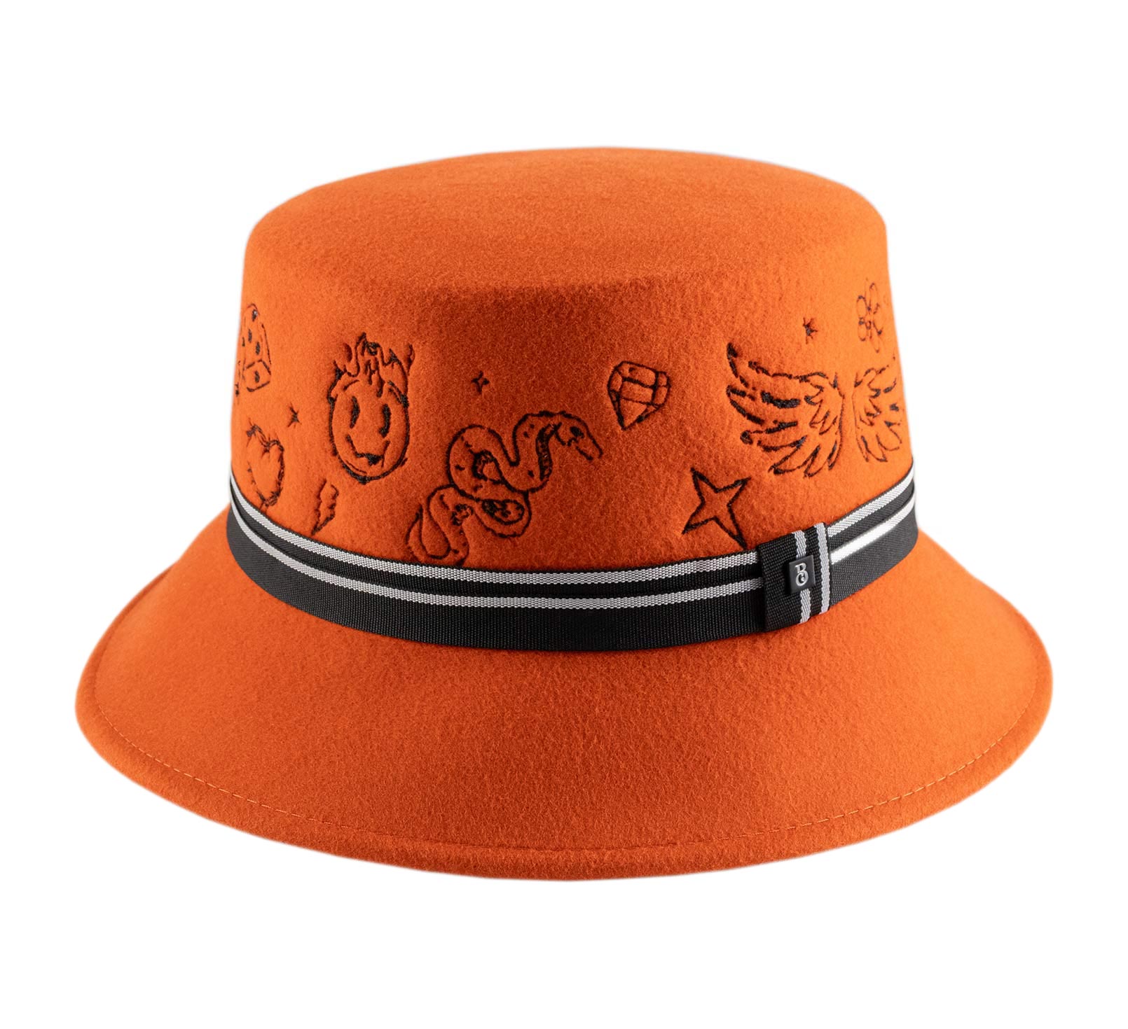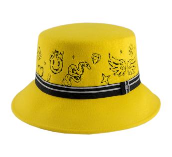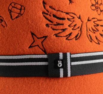 Farbenfroh, mutig und ultra-kreativ, dieser Wollfilz Fischerhüte erfindet die Codes der Kopfbedeckung neu. Seine flache Kopfhöhe ist vollständig mit grafischen, tätowierungsähnlichen Mustern bestickt, für einen urbanen und ausgefallenen Touch. Der gestreifte Galon strukturiert das Ensemble, verstärkt durch ein metallisches Label in der Mitte. Dieses Modell zieht alle Blicke auf sich und behauptet eine wahre Freiheit des Stils.