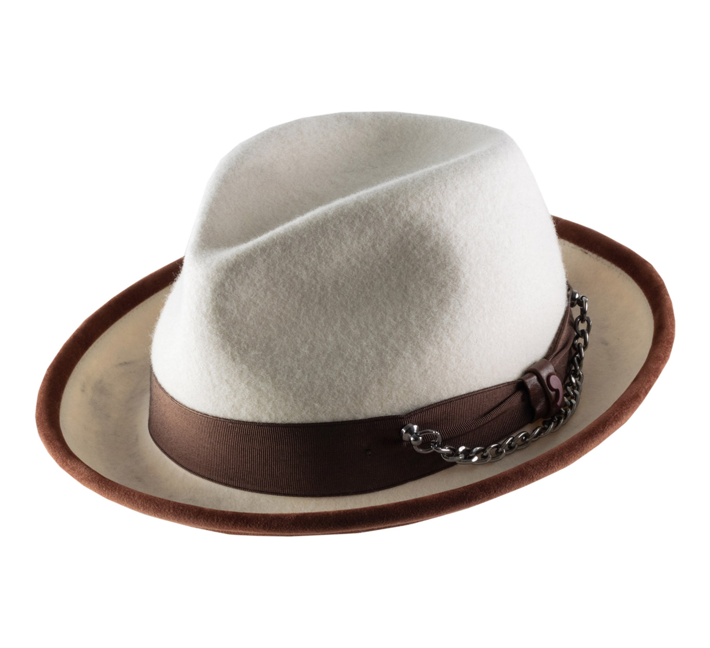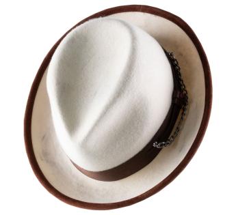 Neue Kreation von Alfonso d'Este. Die Modistin hat sich entschieden, ihr schönes weißes Kleid mit einigen absichtlichen Flecken zu versehen. Sie müssen sich also keine Sorgen mehr um einen Hut machen, der zu schmutzig wird. Genießen Sie auch seine schicke und lässige Natur, denn es handelt sich um einen Trilby, der perfekt an Ihre Stimmung anpassbar ist.
