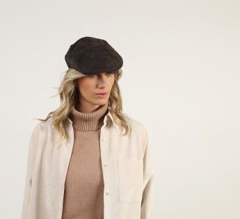 Flatcap aus weichem und flexiblem Schweinsleder. Der Schnitt weist an den Seiten eine leichte Weite auf, bevor er sich nach vorne hin verjüngt, bedingt durch die Krümmung der Krempenbreite. Das Modell ist zeitlos und ergänzt unsere Looks mit einem retro und gleichzeitig modernen Touch. Es hat eine gut durchdachte distressed Optik.