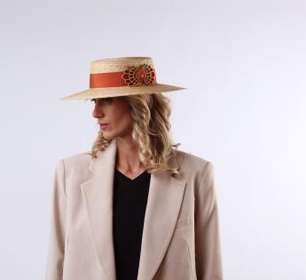 Schlapphut im trendigen Flechtwerk aus genähtem Stroh im boho-chic Stil. Er ist mit einem terrakotta Satin und einer breiten Holzschleife mit runden, femininen Formen geschmückt. Ein originelles Modell in voller Eleganz, um Outfits und Gesichtszüge zu verschönern und die Welt zu deinen Füßen zu legen. Es ist ideal, um einen fröhlichen Look zu kreieren.