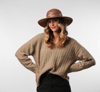 Aus natürlich wasserabweisend gefilzter Wolle gefertigt, bietet er Komfort, Schutz und Halt. Seine flexible Form mit breiten Krempen umrahmt das Gesicht mit Anmut und Weiblichkeit. Ein außergewöhnliches Stück, geboren aus handwerklichem Können, um seinen Stil mit Charakter zu behaupten.