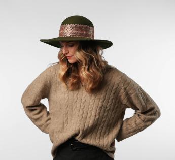 Aus natürlich wasserabweisend gefilzter Wolle gefertigt, bietet er Komfort, Schutz und Halt. Seine flexible Form mit breiten Krempen umrahmt das Gesicht mit Anmut und Weiblichkeit. Ein außergewöhnliches Stück, geboren aus handwerklichem Können, um seinen Stil mit Charakter zu behaupten.